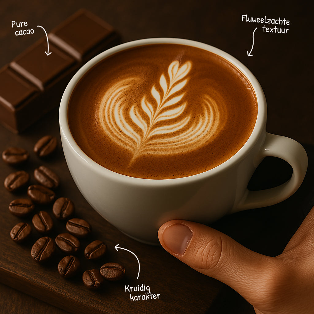 Deze bonen hebben een kruidig karakter dat de zintuigen prikkelt. Elke slok onthult een rijke en volle smaak, waarbij de pure cacao-aroma’s een prominente rol spelen. De koffie heeft een fluweelzachte textuur die het genot versterkt.